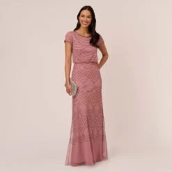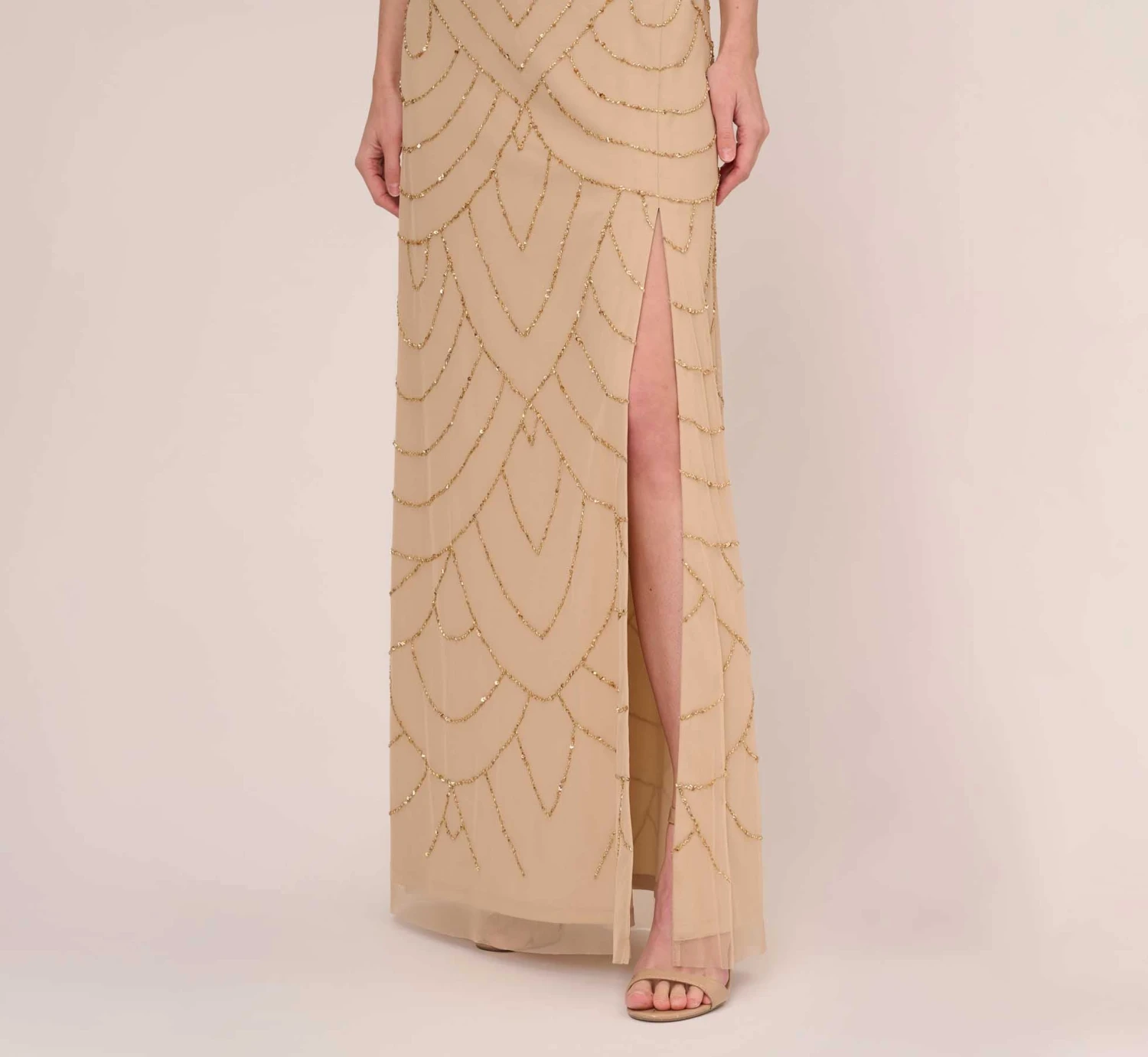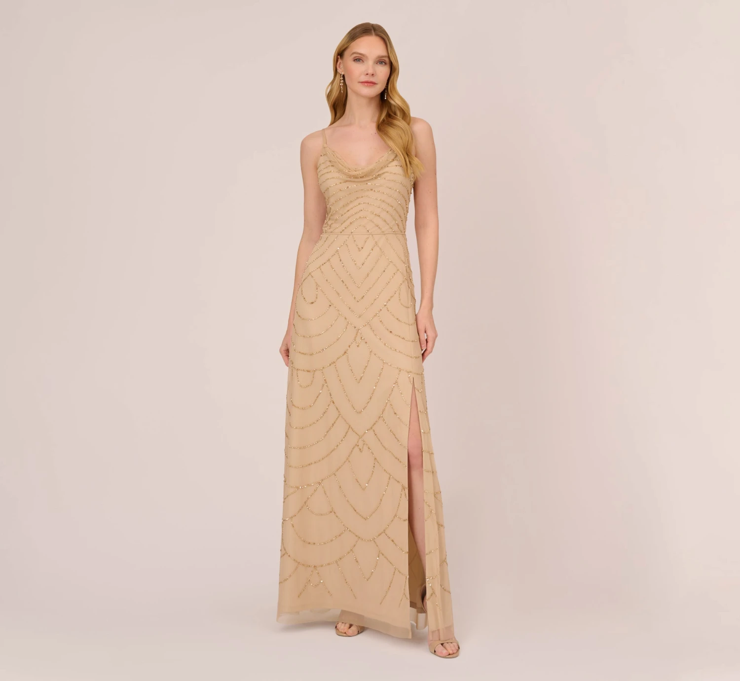 A modern take on beloved beading, this formal dress is a shining addition. This beaded dress features a fitted bodice with cowl neckline, thin tank straps, and a mermaid skirt with slit at the side. This cowl-neck gown is fully lined and has a mesh overlay covered in sparkling art decosequin beading. A zipper closure completes the design at the center back of this beaded gown. Paired with a matching metallic heel and statement earrings, this dress is an unforgettable style.