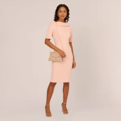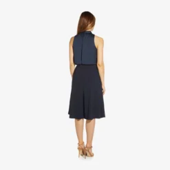 Modern and iconic, our fit-and-flare midi dress is crafted of a lightweight woven crepe with sheer illusion mesh inserts. All the details: modern bateau neckline, convenient side pockets and back hook-and-eye/zip closure. Be best dressed at cocktail parties, bridal showers, wedding receptions and any other celebratory occasion.