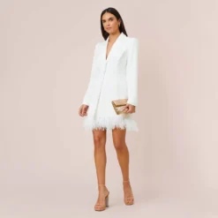 Trend-forward details and a classic silhouette make this jumpsuit sparkle. This formal jumpsuit features a faux wrap bodice with a sweetheart neckline and beaded tank straps that are adorned with feather accents. Wide legs add contrast to the otherwise streamlined look. Designed from crepe fabric, this dressy jumpsuit has a comfortable level of stretch. A zipper closure at the center back completes this jumpsuit. A nude or metallic high heel and a beaded clutch will perfect this jumpsuit.