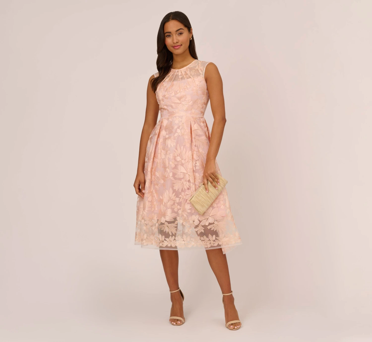 This fit and flare dress features a sleeveless bodice with sheer crew neckline with shirred details. A full, pleated skirt adds contrast to this midi dress. The floral embroidered overlay extends beyond the lining for a playful look. Style this sweet look with neutral heels for adaytime event, or add metallic accessories and a clutch for an evening out.