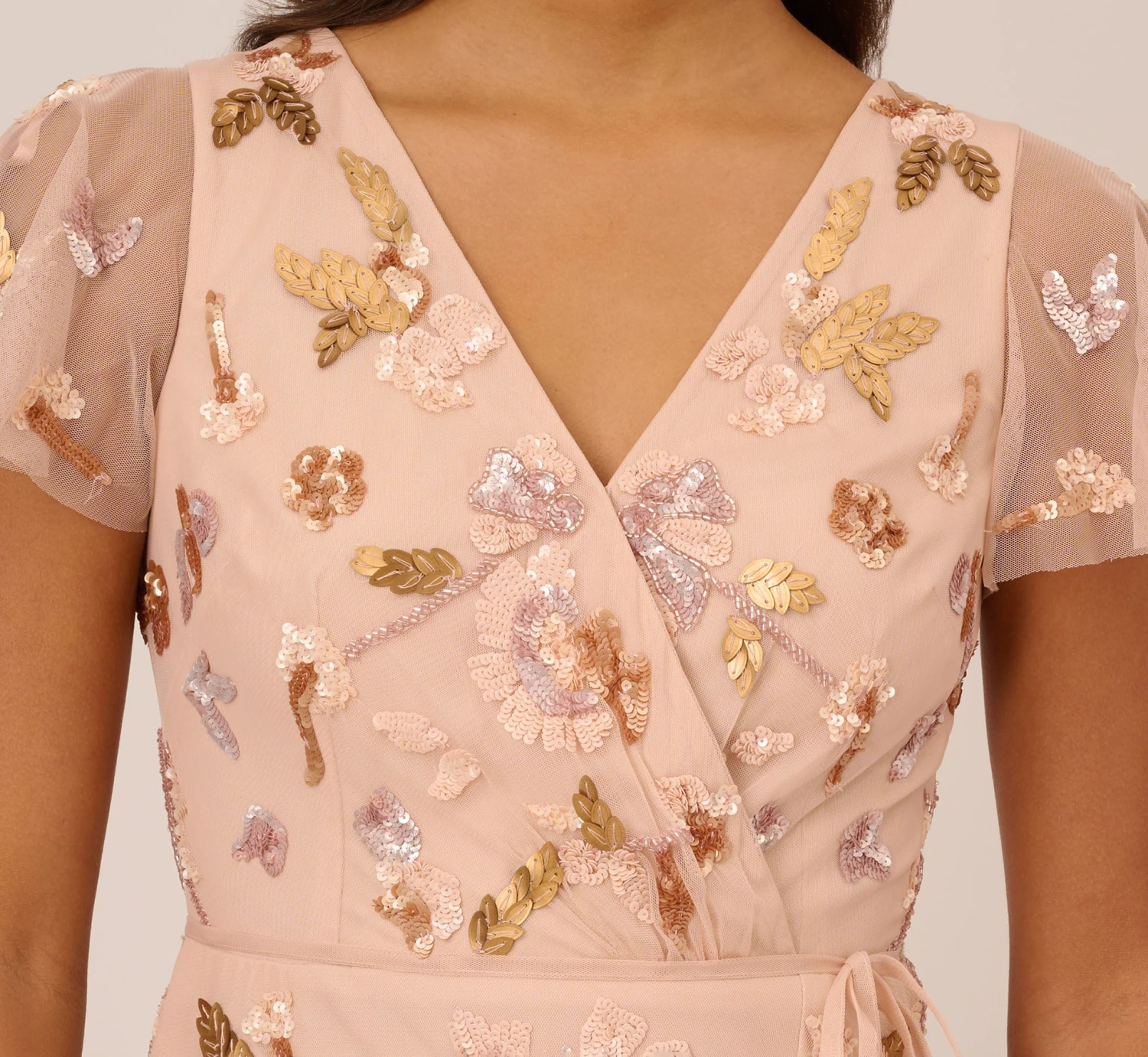 A beloved silhouette gets formal in this gorgeous beaded dress. This cocktail dress features a fitted surplice bodice with v-neckline and a faux tie accent at the waist that creates a wrap dress look. Sheer, short flutter sleeves and a midi skirt add a sweet touch to this party dress. Fully lined through the body, this dress’s mesh overlay is adorned with romantic sequin beading that perfectly complements the dress color. A simple pair of heels and a satin clutch is all this dress needs for a night out.