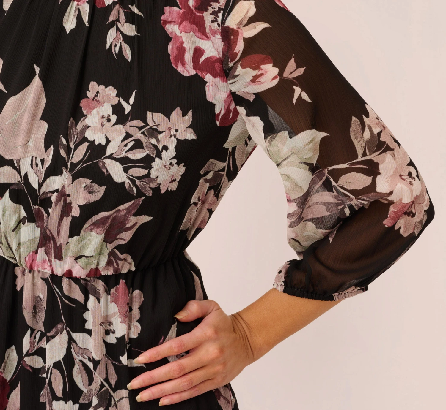 Effortless and comfortable, this three quarter sleeve dress is a beautiful look no matter the season. This floral dress features a fitted bodice with boat neckline and soft skirt. The three quarter length bishop sleeves are sheer and flowing. This cute dress is crafted from floral printed chiffon fabric and has an elastic waist for a comfortable fit for all body types. The soft skirt has a tiered design adding a final romantic touch to this pull-on dress. Perfect for a day at the office or a date night out, this chiffon dress is a pretty look.