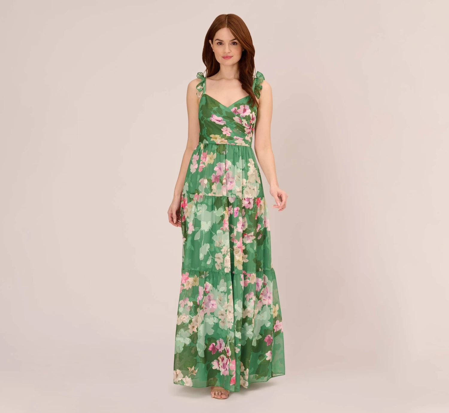 Adrianna Papell Floral Chiffon Tiered Gown With Ruffle Details In Green Multi