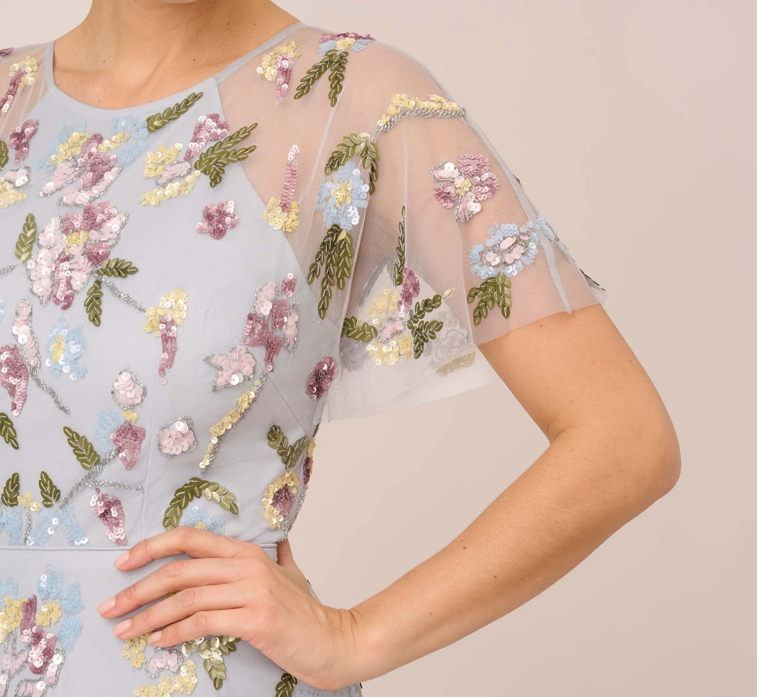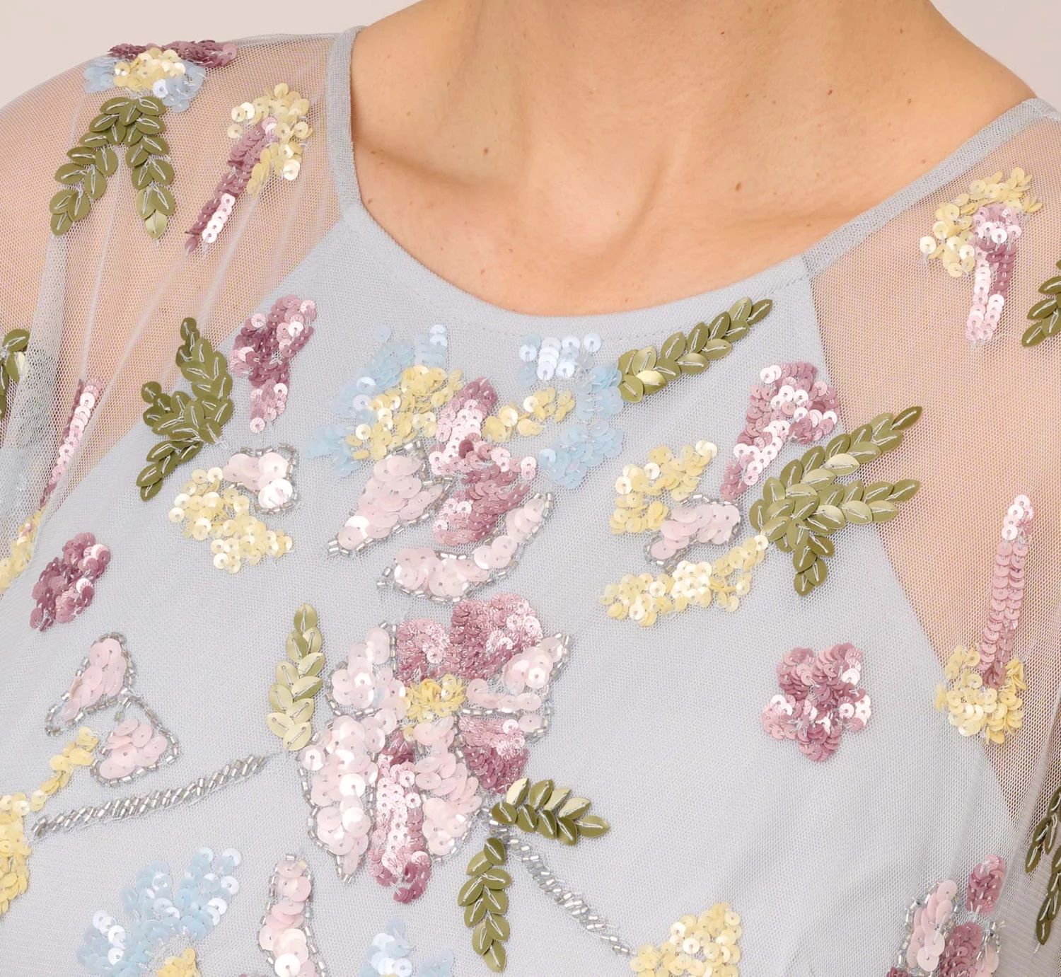 Adrianna Papell Floral Hand Beaded Illusion Long A-Line Gown In Glacier