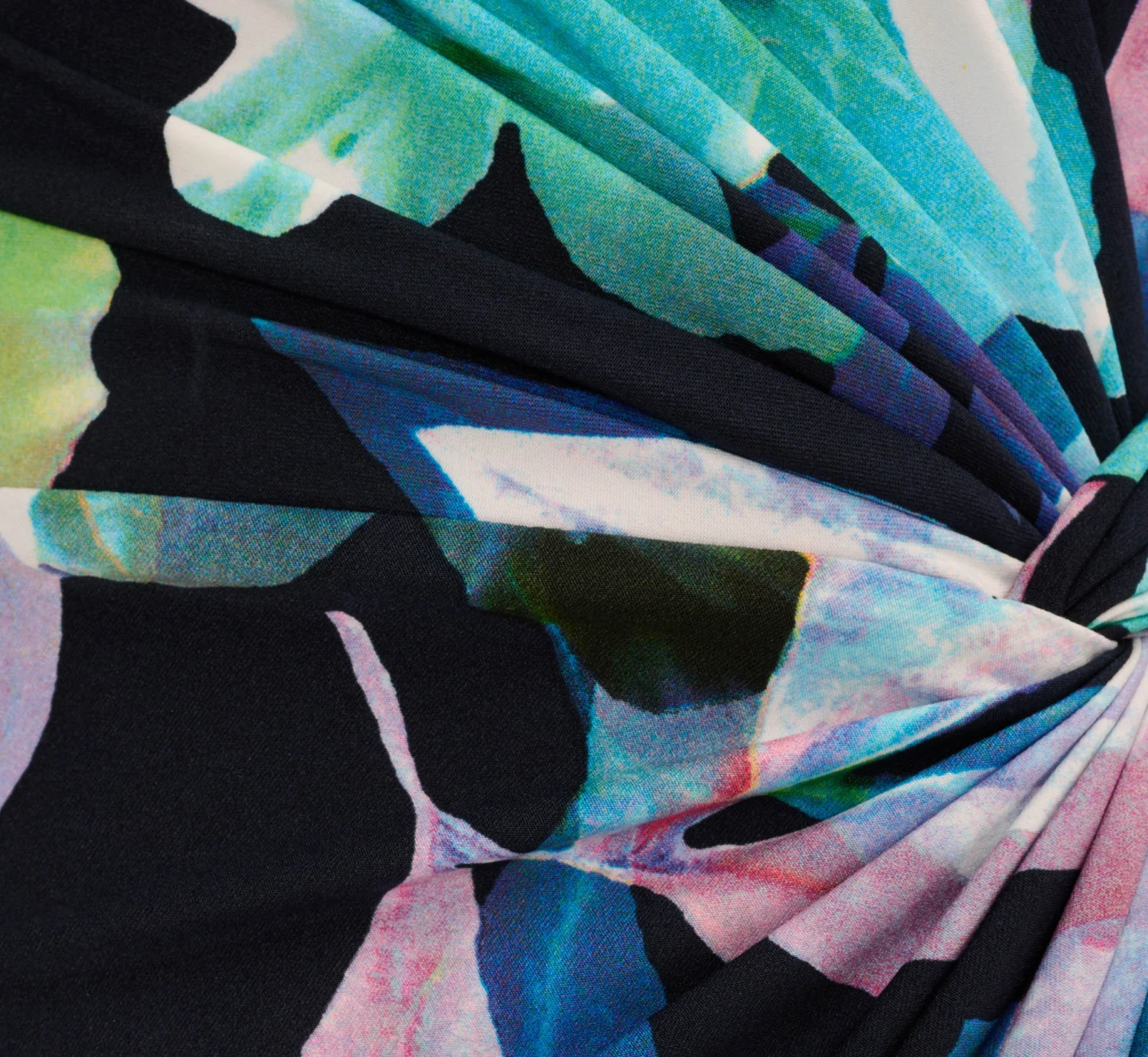 Stunning watercolor florals brighten this classic day-to-night dress. This short dress features a surplice bodice with short sleeves and v-neckline, a shift silhouette and a knotted detail at the waist that creates a beautiful draped look. Designed with floral printed jersey fabric, this dress has a comfortable level of stretch making it the perfect choice for a busy day. A zipper closure completes this sheath dress. Styled for day with a neutral heel and a S’HUG or dressed up for cocktail hour, this floral print dress is an effortless look.