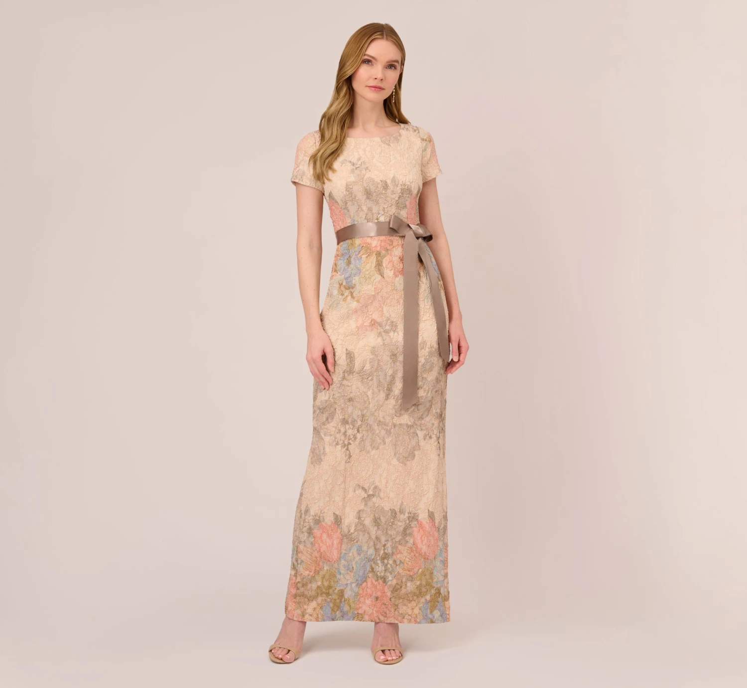 Eye-catching and glamorous, this textured cap sleeve gown features a stunning floral print and subtle metallic shimmer
