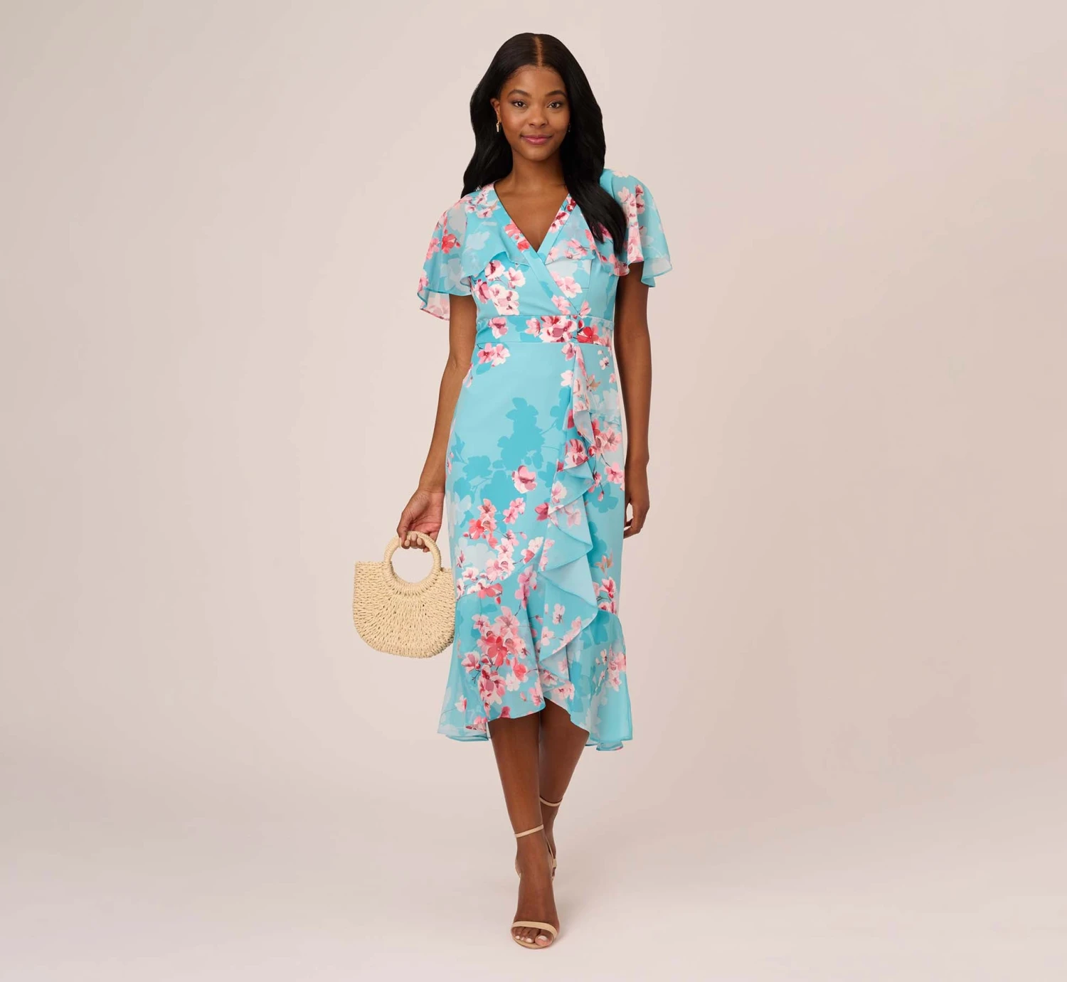 Gorgeously flowing capelet and a cascading chiffon ruffle lend a romantic edge to this stretch twill midi dress in a fresh floral pattern. Features a flattering surplice neckline and banded waist. Flounce hem that sways with each step. Back zipper with hook and eye closure. An easy add to cart for baby/bridal showers, brunch and wedding celebrations.