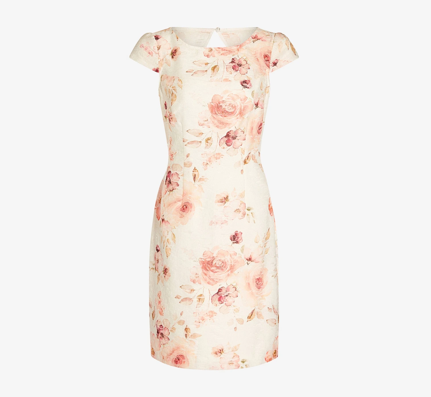 Look good while stealing this show in our streamlined sheath dress in a soft and feminine rose jacquard print. All the details: modern bateau neckline, short sleeves and back zip closure. You found your perfect dress for bridal showers, date nights and cocktail hours.