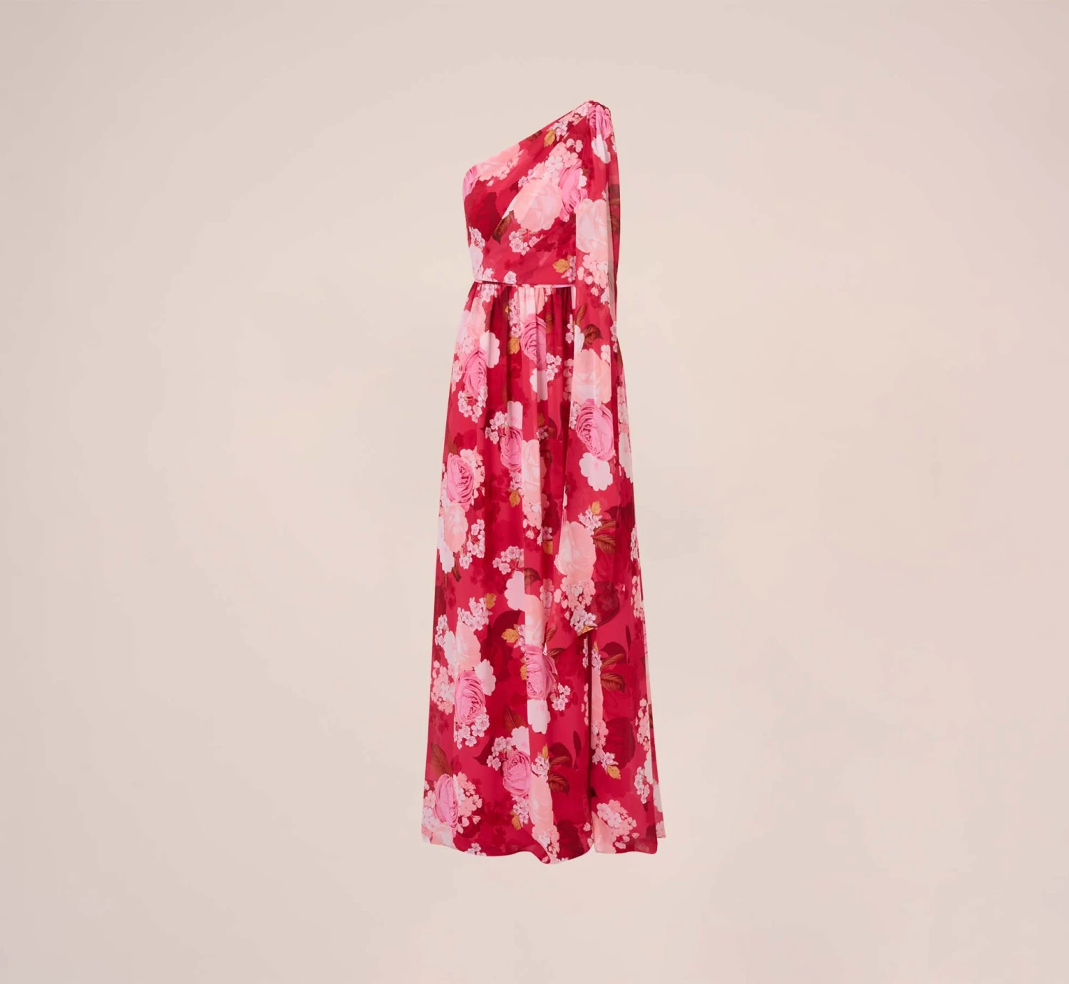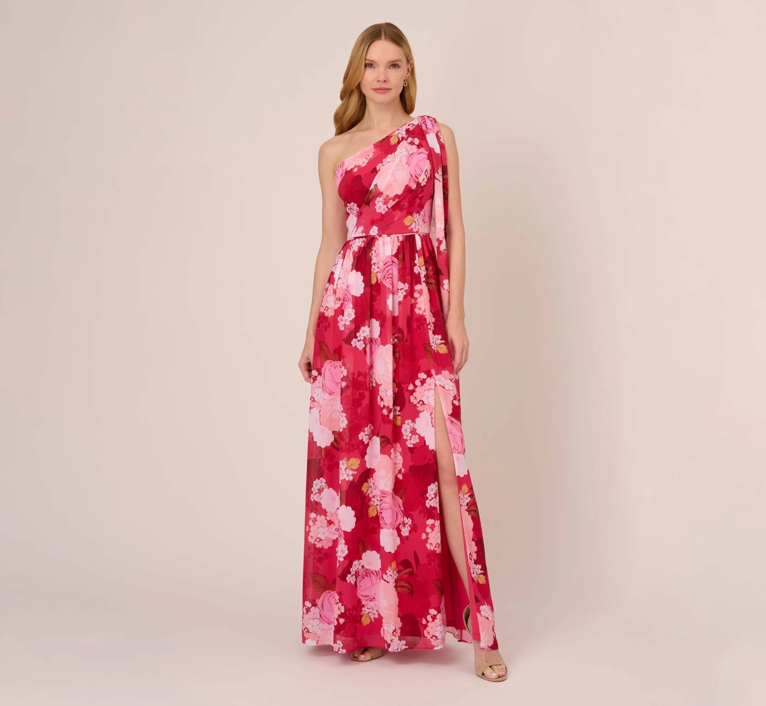 Lightweight and airy, our woven chiffon gown is printed in a bold floral and impeccably tailored in a one-shoulder silhouette with a playful bow at the shoulder. The floor-sweeping skirt is designed with pleating for added movement and sway. Front slit for dramatic effect. Side zipper with hook and eye closure.