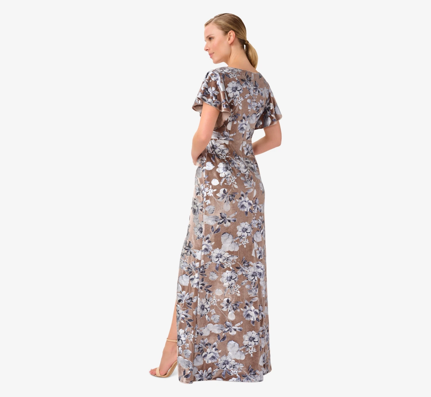 Feminine and fabulous, this floor-sweeping gown is crafted of a luxe stretch velvet and blooms with a shimmering foil floral print. All the chic details: flattering surplice neckline, floaty flutter sleeves. A seamed waist with gentle ruched accents tops the long, soft skirt with modified flared hem. Whether for a wedding or a black-tie event, you can’t go wrong with a dress this polished.