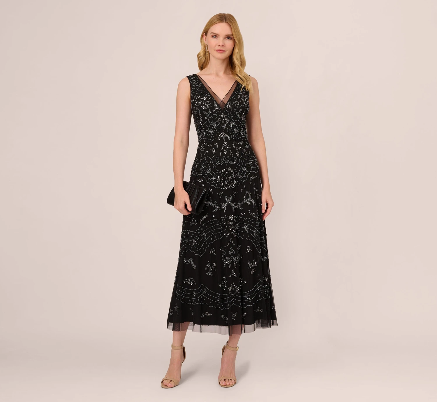 Be party ready in an instant in our effortlessly chic dress that gets treated to allover dazzling hand beadwork. Details we love: the clean v-neckline with sheer trim and the soft pleats along the skirt for added movement and sway. Wearable on repeat to all your special occasions.