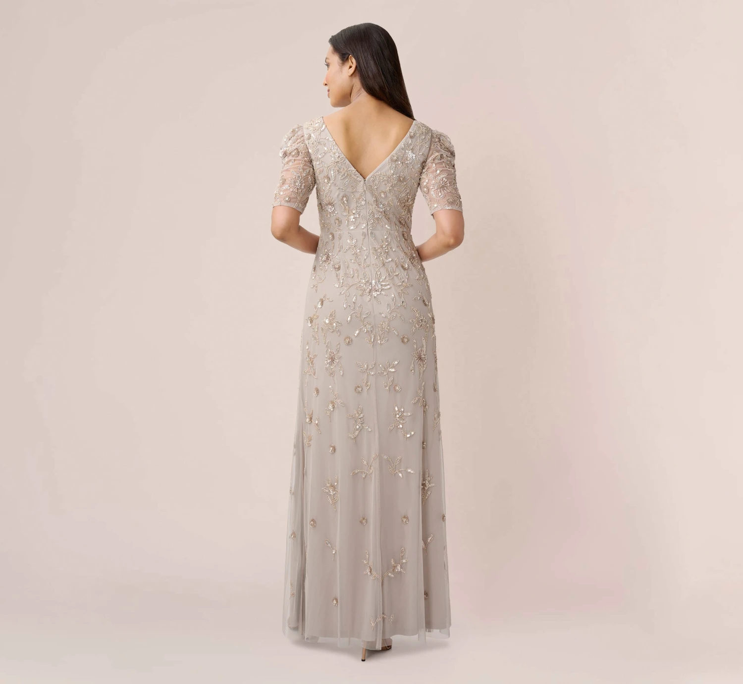 Streamlined and chic, a long, flowing gown in a glittering hand-beaded pattern. Details We Love: the sheer elbow sleeves and flattering v-neckline.