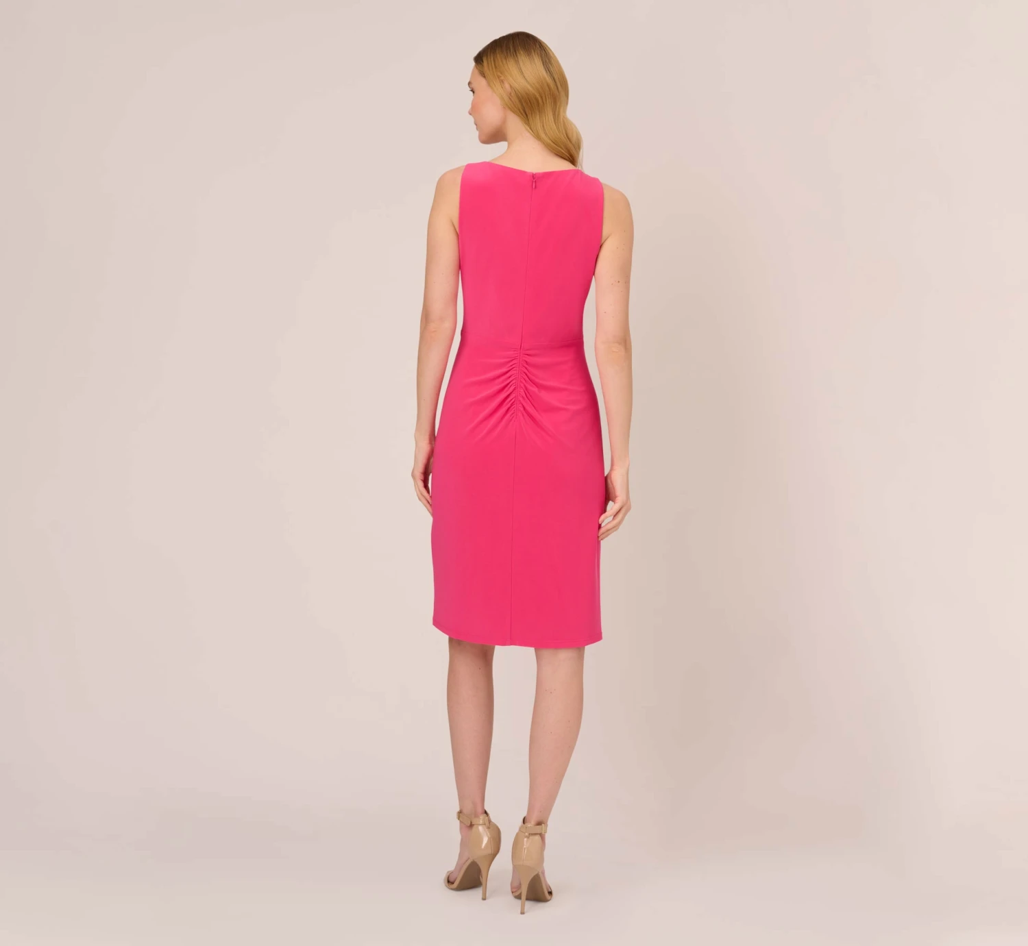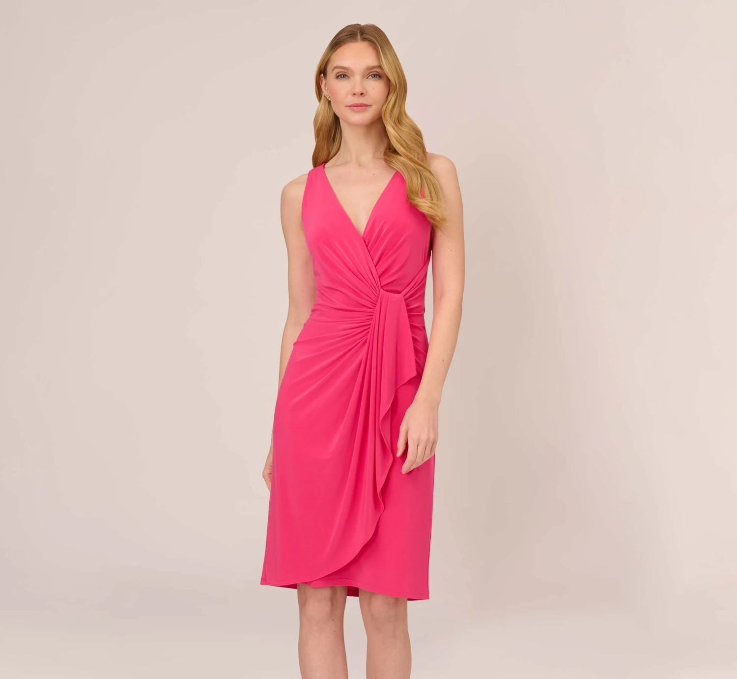 Start your day on an effortless note when you have this sheath dress in your closet. This short dress features a sleeveless bodice with v-neckline and figure-flattering draped details throughout. A surplice styling gives this sleeveless dress a faux-wrap look. Crafted from stretch-knit jersey fabric, this sleeveless dress is a comfortable style. A zipper closure and shirred details at the back complete this dress.
