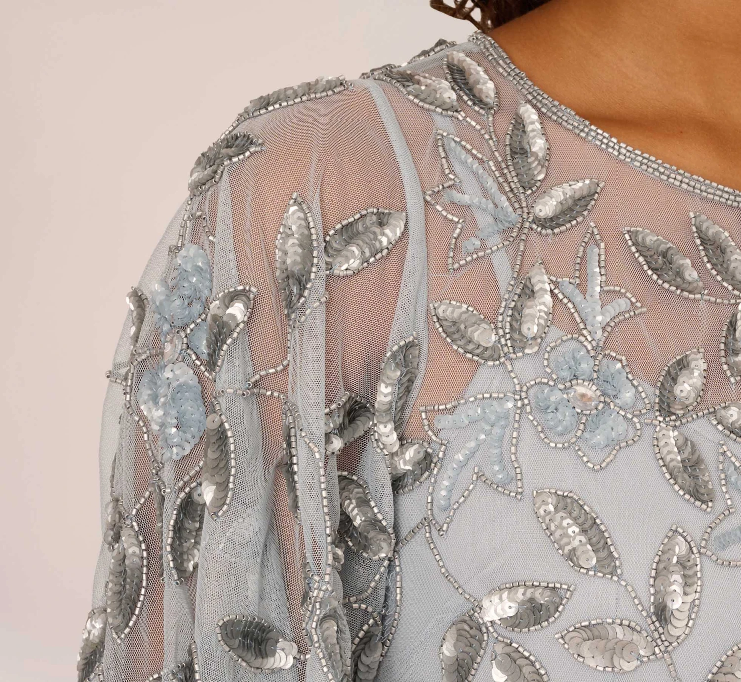 A work of art: our long dress features exquisite hand beadwork in a delicate floral pattern. Designed in a streamlined silhouette that is eased with elbow-length flutter sleeves and soft mermaid skirt with godets that create right amount of movement. All the details: flattering no waist seam and sheer illusion yoke and sleeves. Sleek back zip closure. Calling all mothers-of-the-bride and groom, we love this for you.