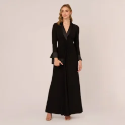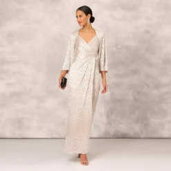 Shimmering and elegant, a long, streamlined sheath accented with allover hand beadwork and modern 3D florals. Details We Love: the chic elbow sleeves and floor-length hem. This black tie dress is perfect to wear to your next gala or as a wedding guest. This gown is also perfect for complimenting your bridal party, from mother of the bride or groom to your bridesmaids.