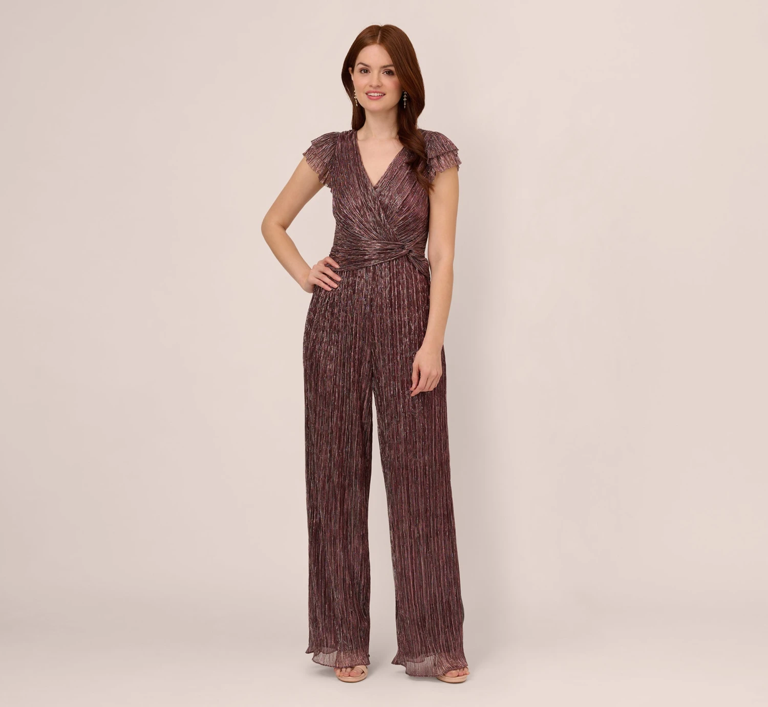 Shine meets style in this short sleeve jumpsuit. This dressy jumpsuit features a surplice bodice with ruffled short sleeves and a v-neckline, a knotted accent at the waist, and wide-leg pants. Crafted from a crinkle-knit, metallic fabric, this semi-formal jumpsuit has a subtle sparkle when it catches the light. A zipper closure at the back completes this design. Styled with metallic heels and a beaded clutch, this jumpsuit is ready for any cocktail party or black-tie wedding.