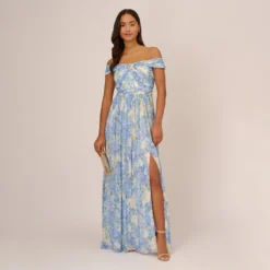 Our timeless and unforgettable fit-and-flare dress is crafted from a floral metallic jacquard and features delicate ruffles along the neckline and armholes. Shaped with princess seaming and a pleated skirt with high/low hem. Sleek back hook-and-eye/zip closure. A classic look for wedding receptions, galas and fundraisers.