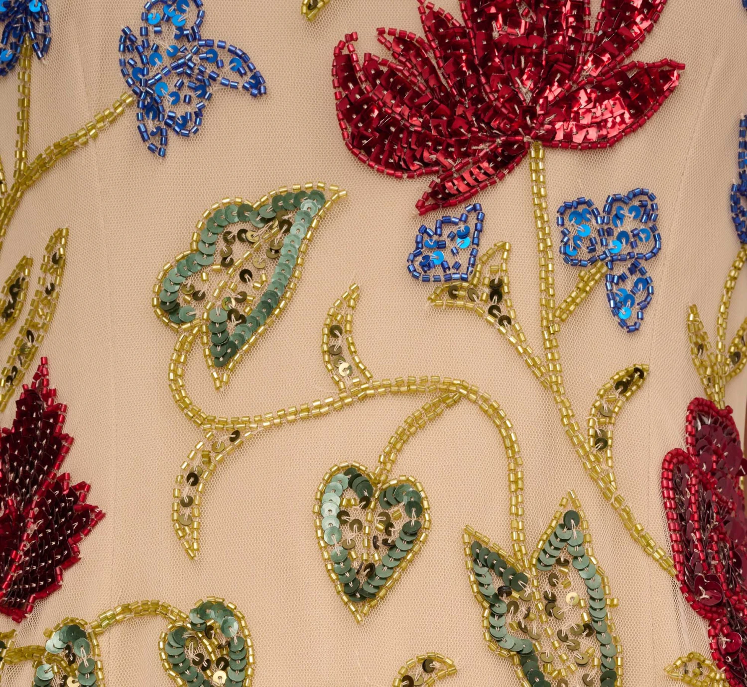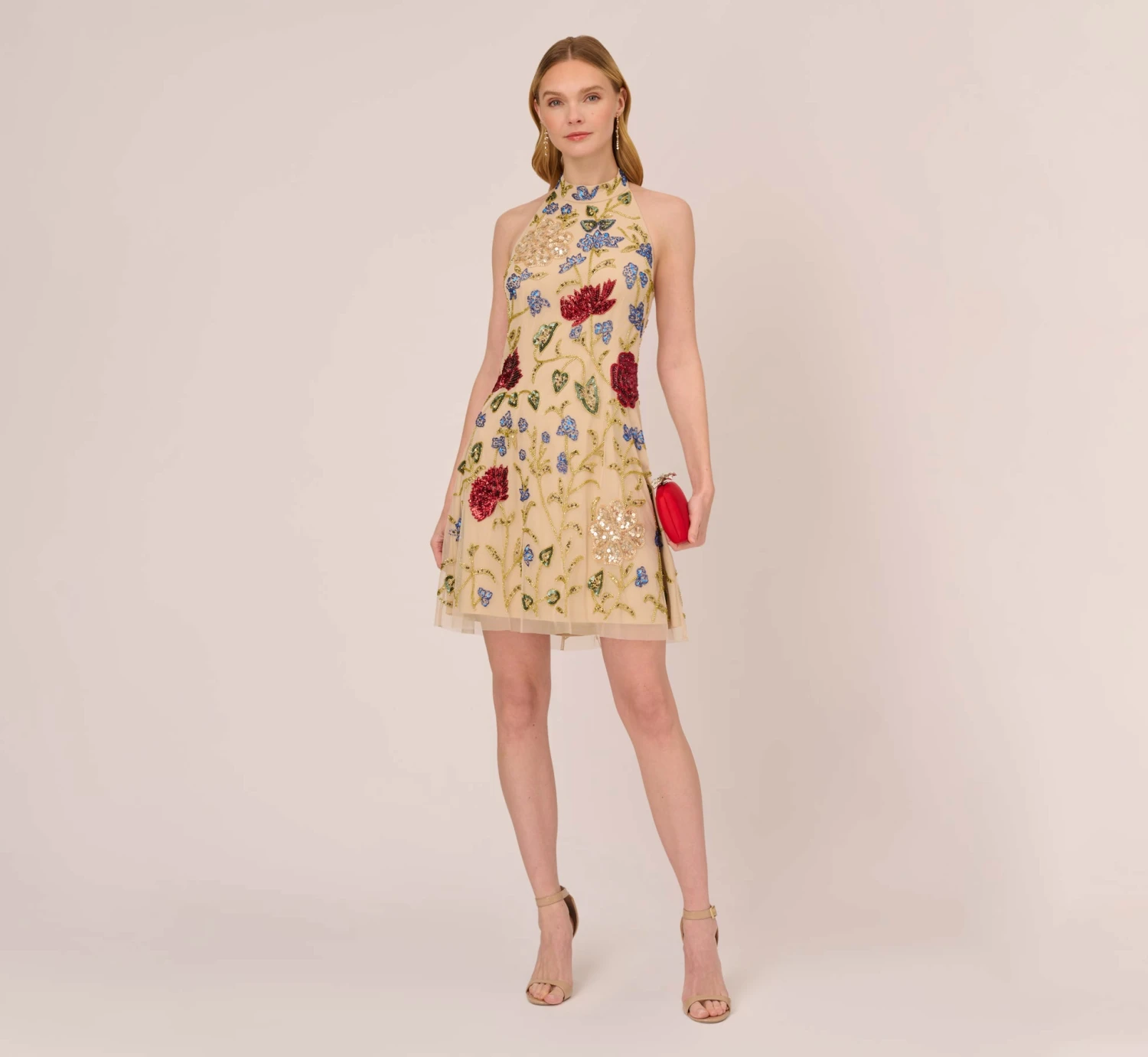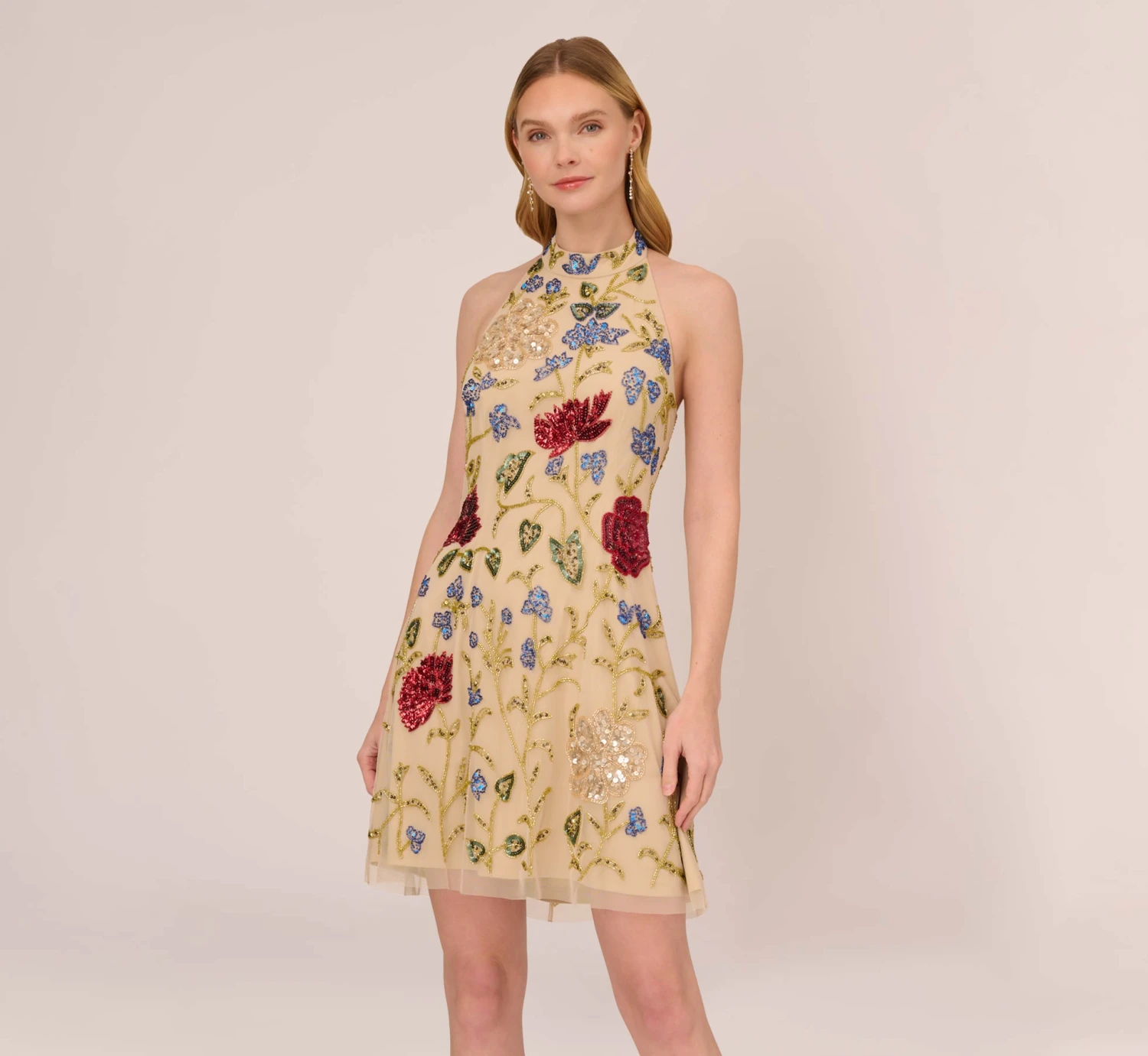 Bold multicolor beading makes this floral cocktail dress demand attention. This beaded dress features a halter neckline with mock neck, open back, and shift silhouette. Fully-lined, this playful dress has a mesh overlay that is embellished with a bright sequin and beaded floral motifthat draws the eye. A zipper closure and hook and eye at the neckline complete this trapeze dress. Add a nude heel and let this mock neck dress shine.