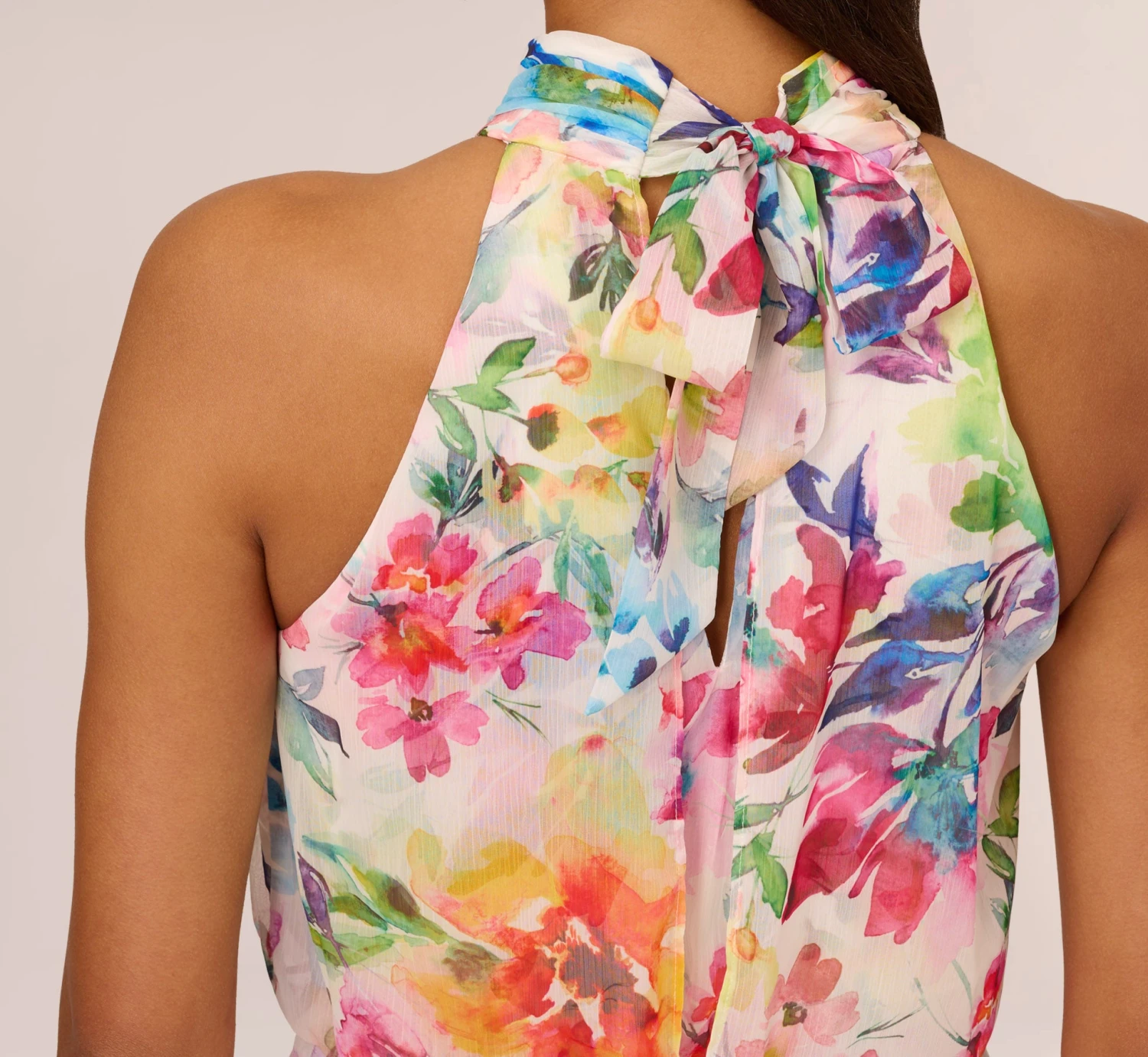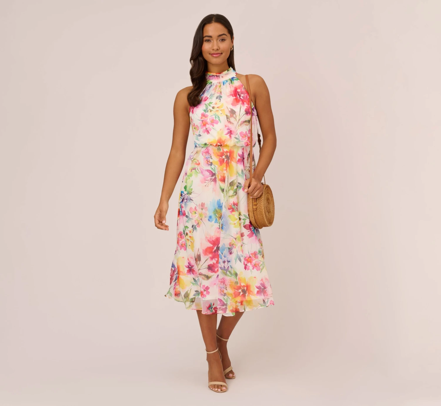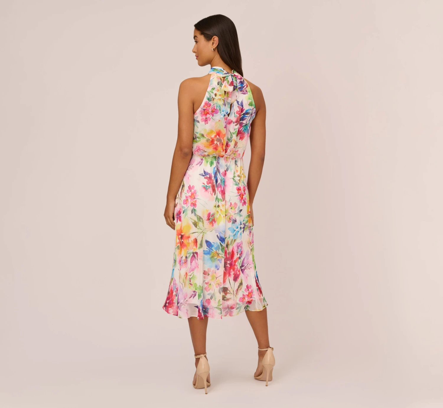 Simple yet sweet, this chiffon dress makes a statement. This floral dress features a halter neckline with mock neck collar, blouson bodice, and a midi skirt. Crafted from crinkle chiffon, this pull-on dress has a comfortable elastic waistline and a self-tie at the back of the neck. Printedwith a playful multicolor floral design, this midi dress is a stunning look. Teamed with a neutral heel for day or night, this halter dress will be a fast favorite.