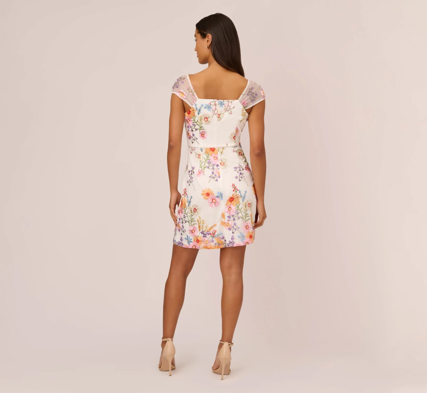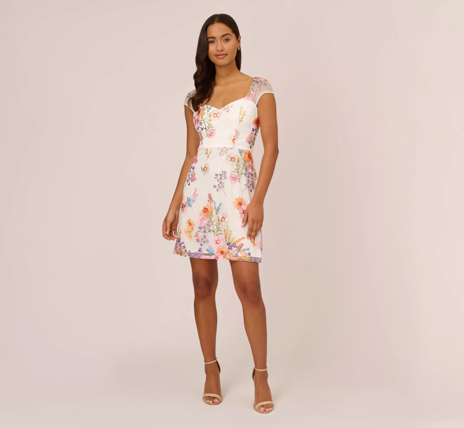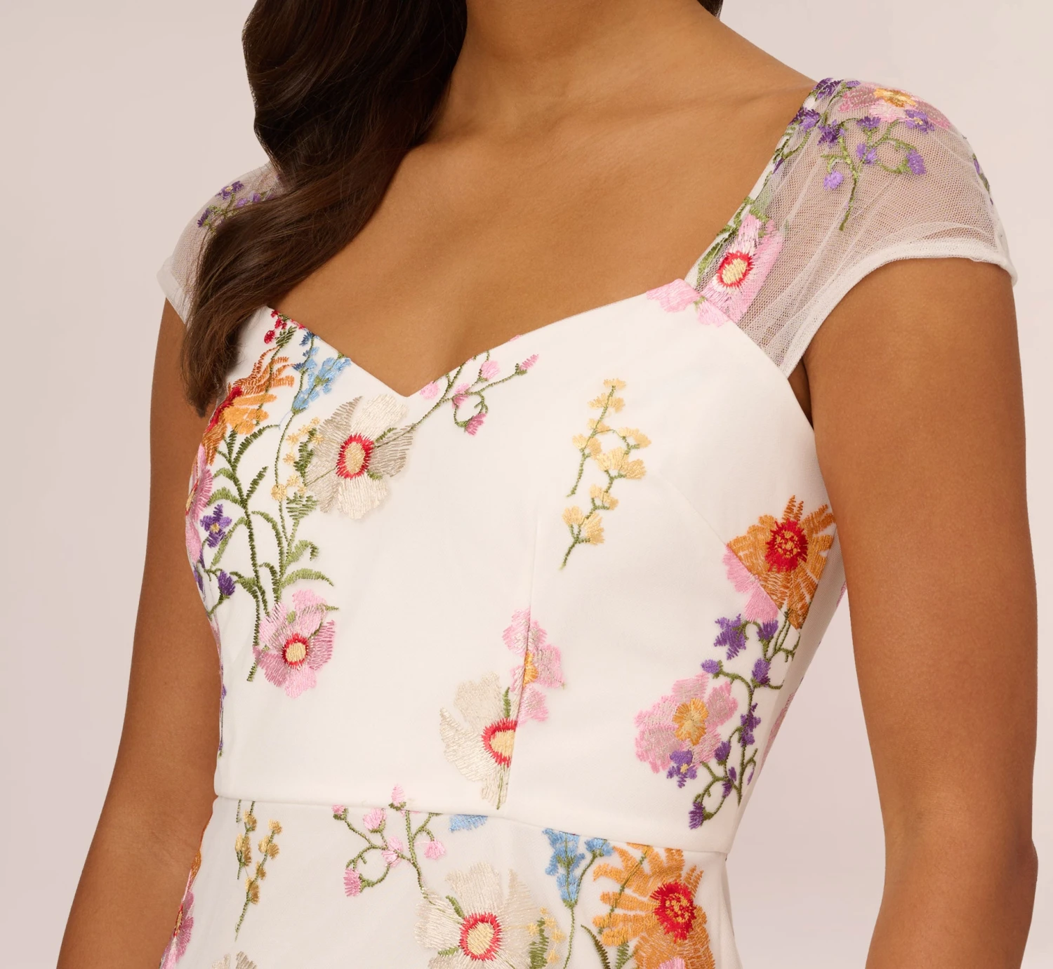 Bring the bloom in this bright and beautiful embroidered dress. This floral dress features a v-neckline, an a-line silhouette, and sheer cap sleeves with delicately pleated details. Bright flowers are embroidered throughout this pretty a-line dress. Paired with neutral or metallic heelsand a clutch, this floral embroidered dress will shine for day or night.