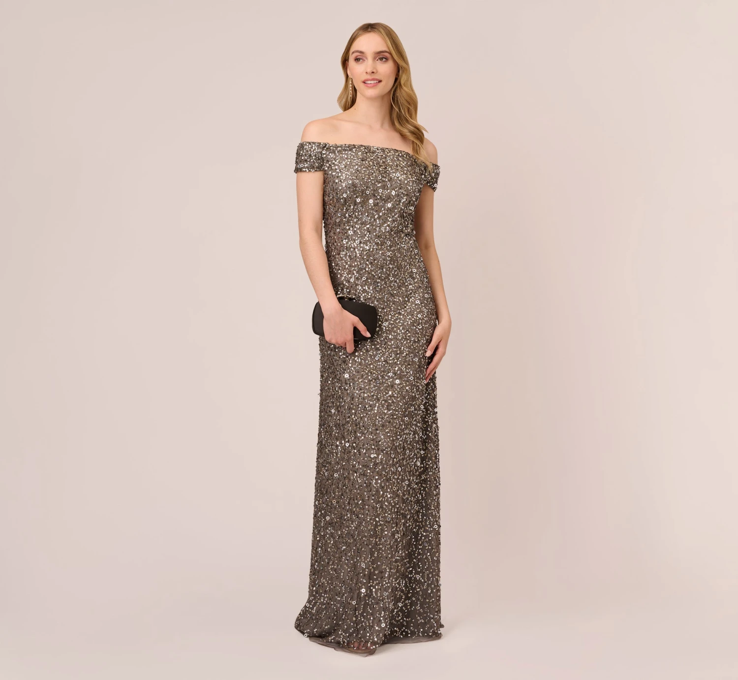 Adrianna Papell Off The Shoulder Sequin Beaded Gown In Lead