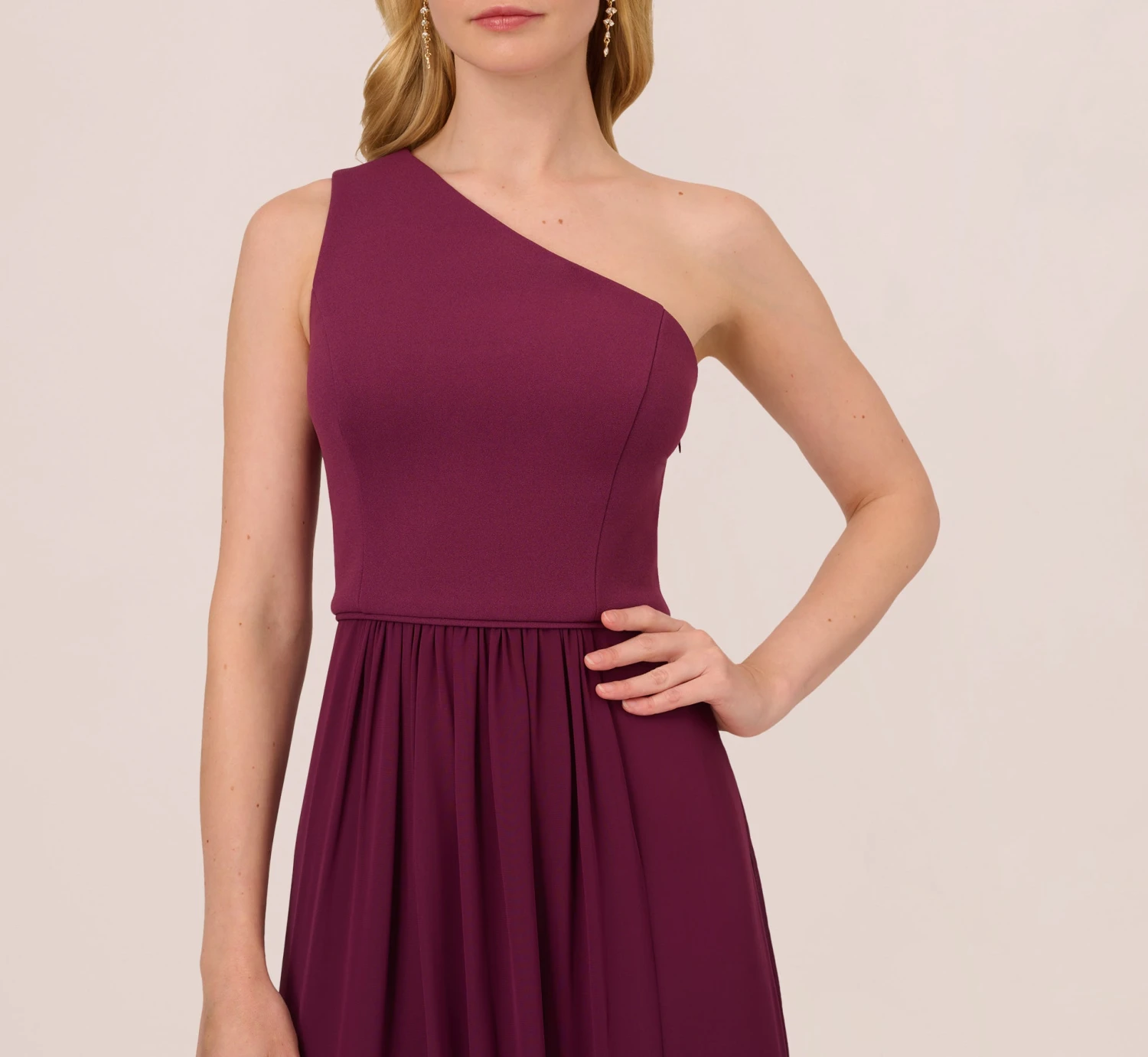 Lightweight, soft and fits like a dream, our woven chiffon floor-sweeping gown features a one-shoulder asymmetric neckline. Details: Pretty pleats at the waist for added dimension and movement. Bridesmaids, party-goers and anytime you have a special occasion, you’re going to look and feel great in this.