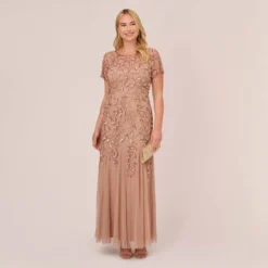 A scalloped pattern of sparkling beads cascade down this beautiful gown, featuring a flattering blouson silhouette.