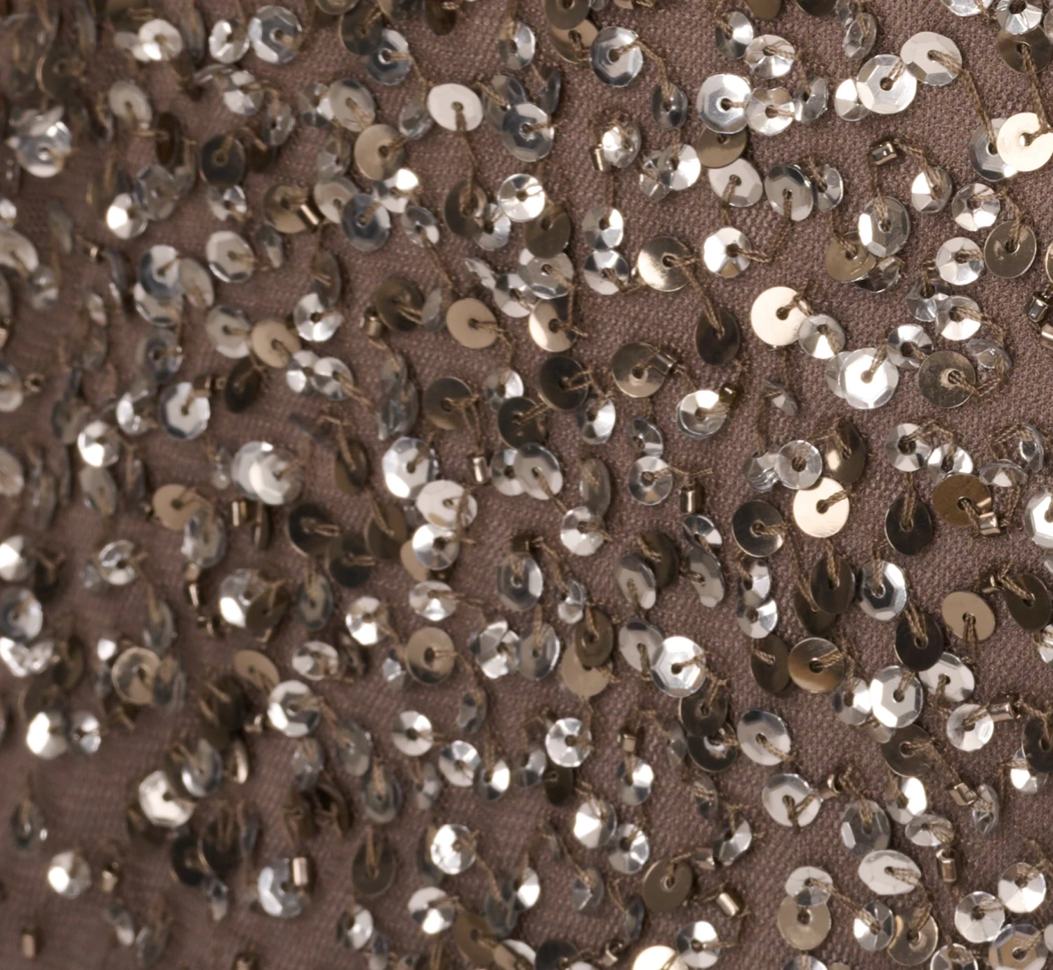 Complete with a stunning illusion necklace and keyhole back, this shimmering three quarter sleeve gown exudes elegance.This Adrianna Papell design has been made from the finest and most luxurious fabrics. All bead work, embroidery and ornamentation has been done completely by hand. Slight irregularities or variations should not be regarded as defective or damaged, rather a testament to the garment’s unique beauty.