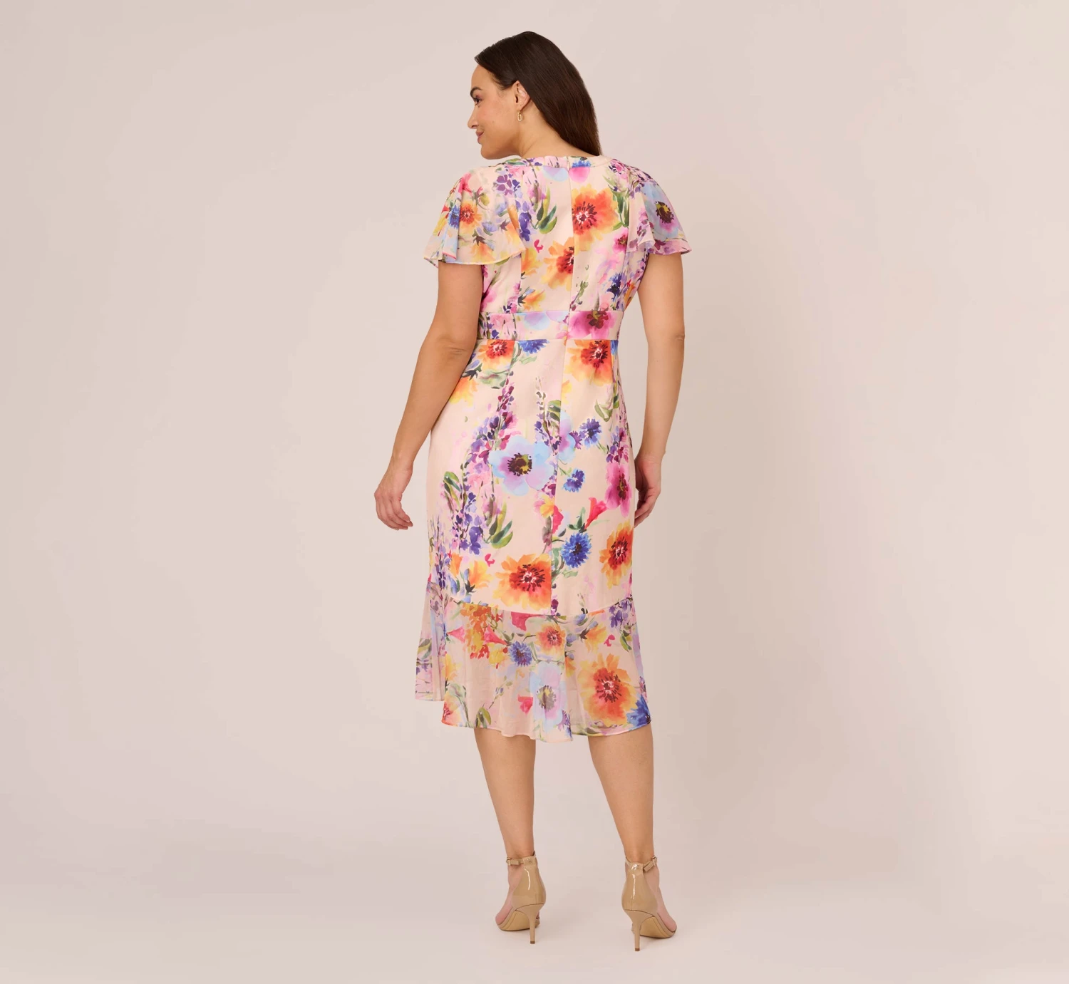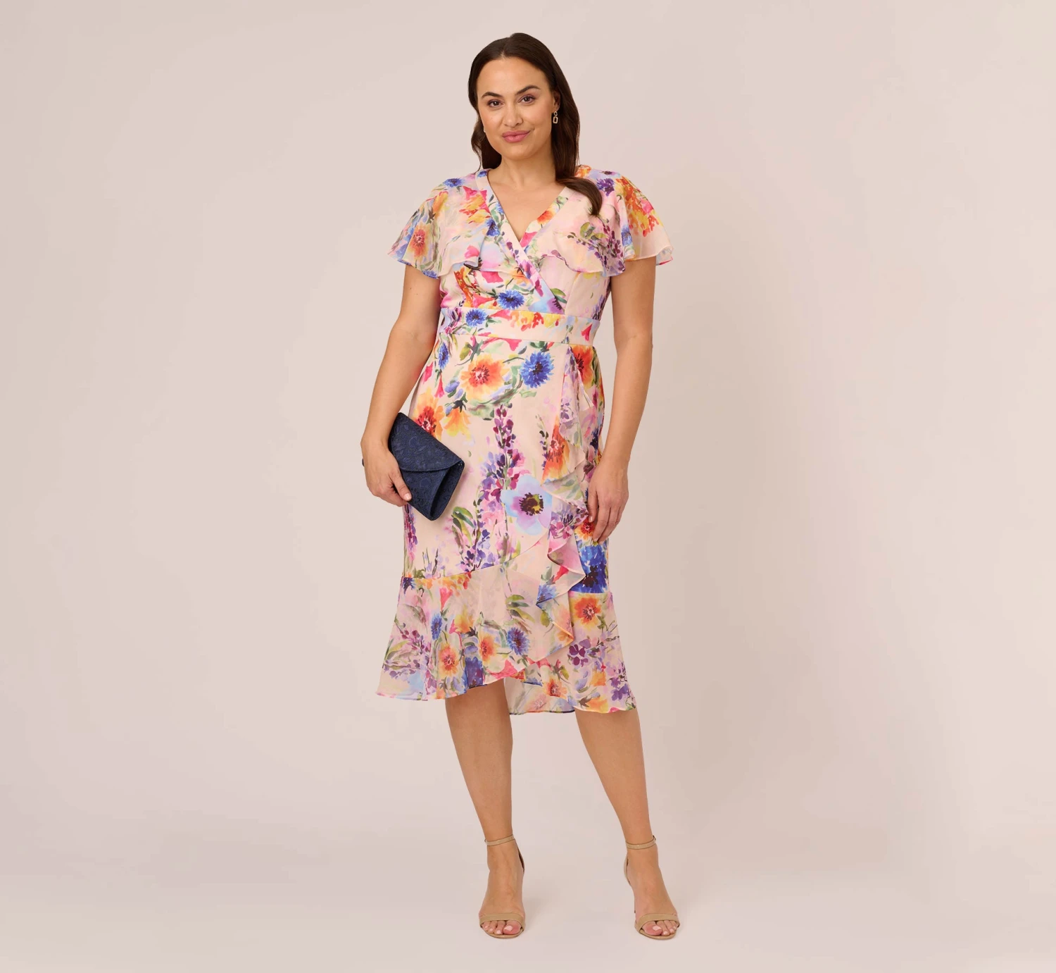 Kimono-inspired midi faux wrap dress is cut from a luxe stretch knit fabric in a vibrant floral print. Obsessed with the surplice neckline, sheer short sleeves, banded waist and cascading ruffled chiffon skirt that creates a playful look with each step. We love this for so many reasons, especially for bridal showers, brunch, dinner dates. (P.S. Makes a perfect addition to your travel wardrobe.)