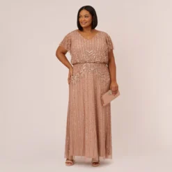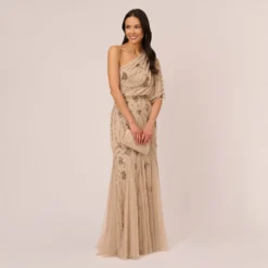 Shimmering, light as air and exceptionally flattering, this floor-sweeping gown is designed in our signature and ultra-flattering blouson fit. Obsessed with the shimmering hand beadwork in a geometric pattern. Details we love: the dramatic sheer illusion flutter sleeves.