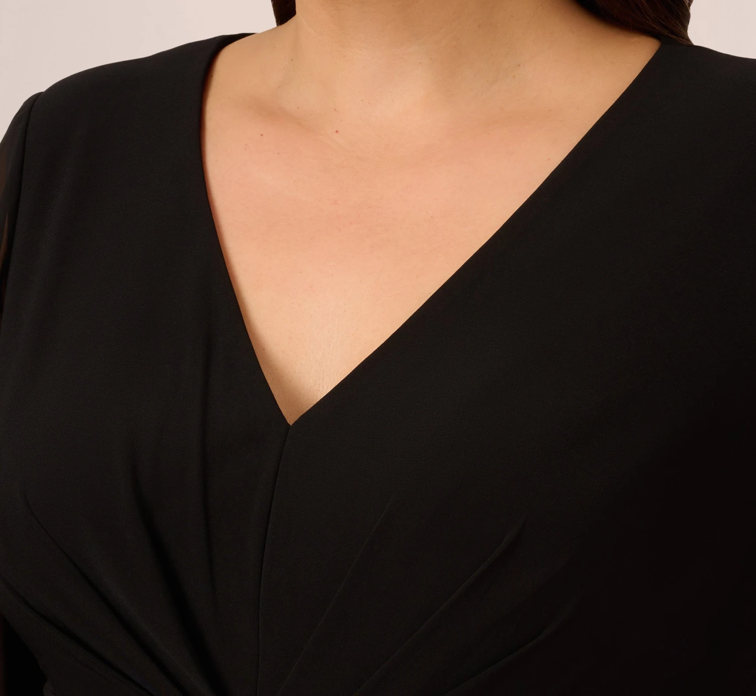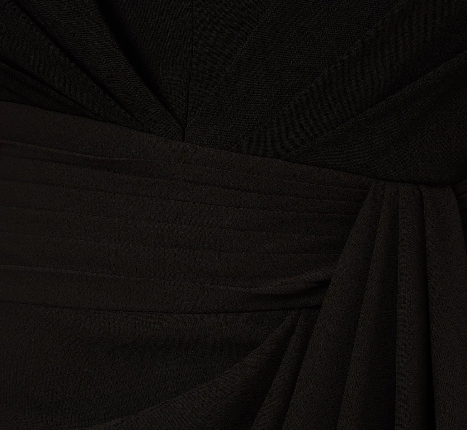 Wherever you’re headed, this long sleeve jumpsuit will be a go-to look. The jumpsuit features a fitted bodice with v-neckline and long bishop sleeves. The chiffon overlay showcases pleating at the bodice before cascading down the jumpsuit’s silhouette. This elegant jumpsuit has wide legpants and a zipper back. Crafted from jersey fabric, this jumpsuit is very stretchy and will be comfortable all day. Paired with open-toed heels and sparkling jewels for an evening event or a closed-toe pump for day, this dressy jumpsuit is an appropriate look for all of your events.