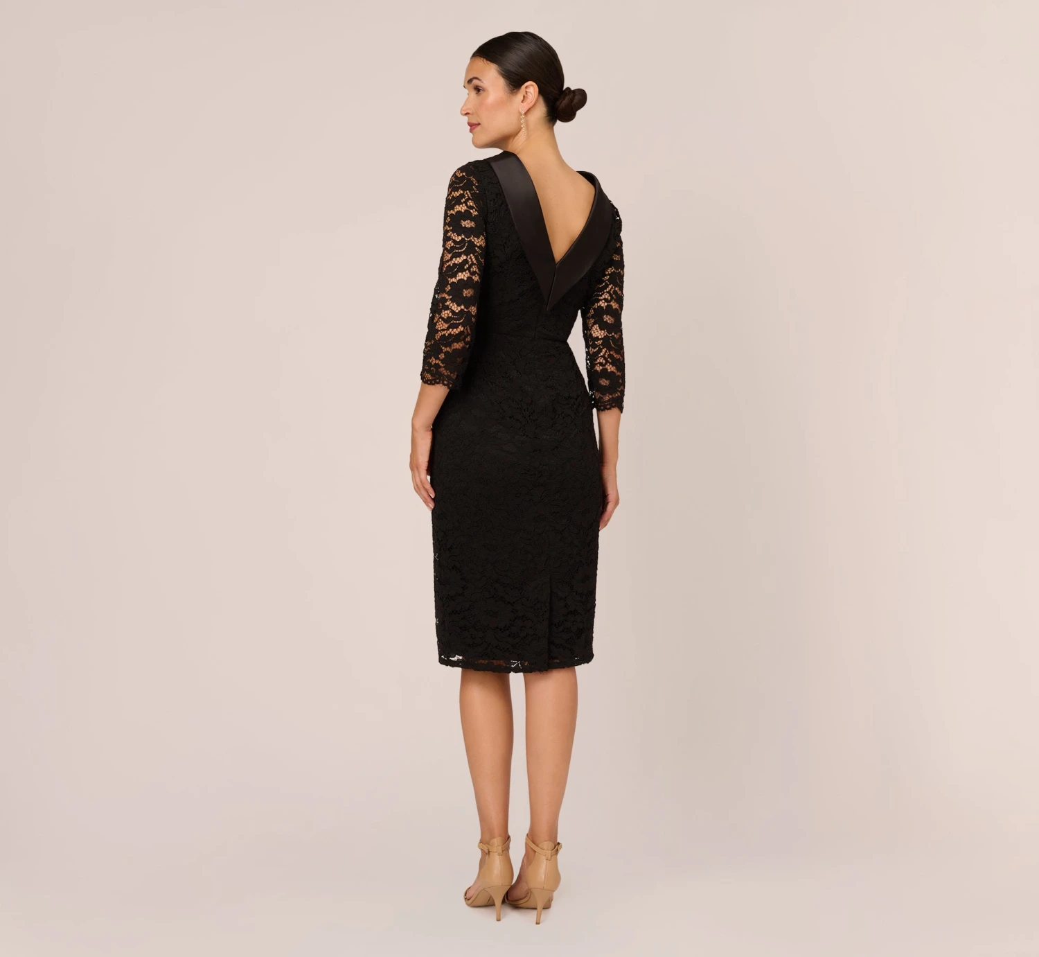 Classic elements make this a lace dress an elegant choice. This sheath dress features a fitted silhouette, satin roll neck collar that flanks the v-back, and sheer elbow-length sleeves with scalloped hems. Crafted from knit lace fabric that is lined through the body, this party dress is apretty cocktail attire or semi formal look. A zipper closure at the center back and a slit at the skirt complete the design. Paired with nude heels and a satin clutch, this lace dress is a timeless look.