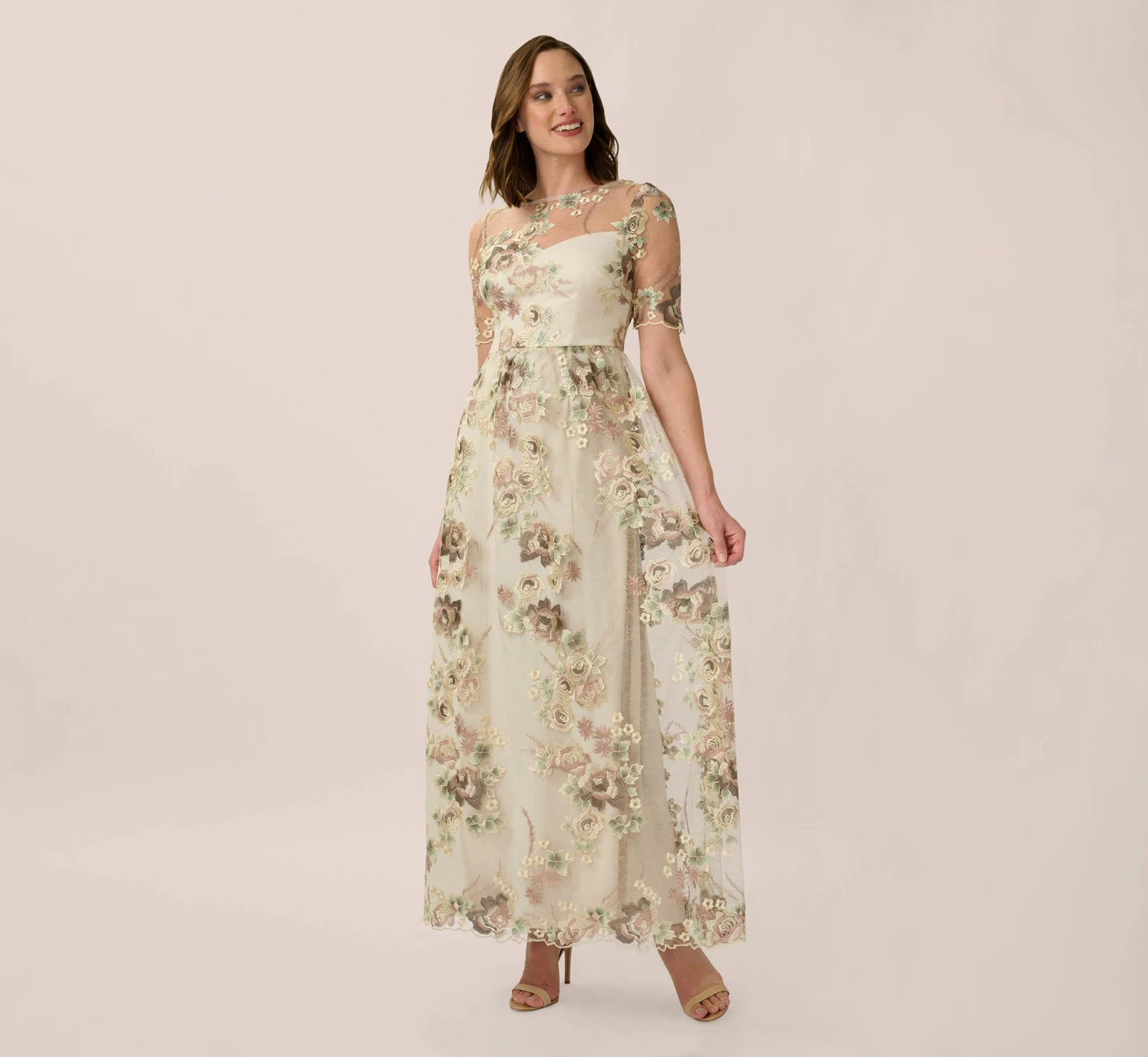 Demure and romantic, this long lace gown is embroidered with vintage inspired rose bouquets. Designed in a stunning curve-skimming silhouette, this A-line dress also features pretty scalloped edging, a sheer boat neckline, back and sleeves. Complement this ultra-feminine look with pretty satin pumps.