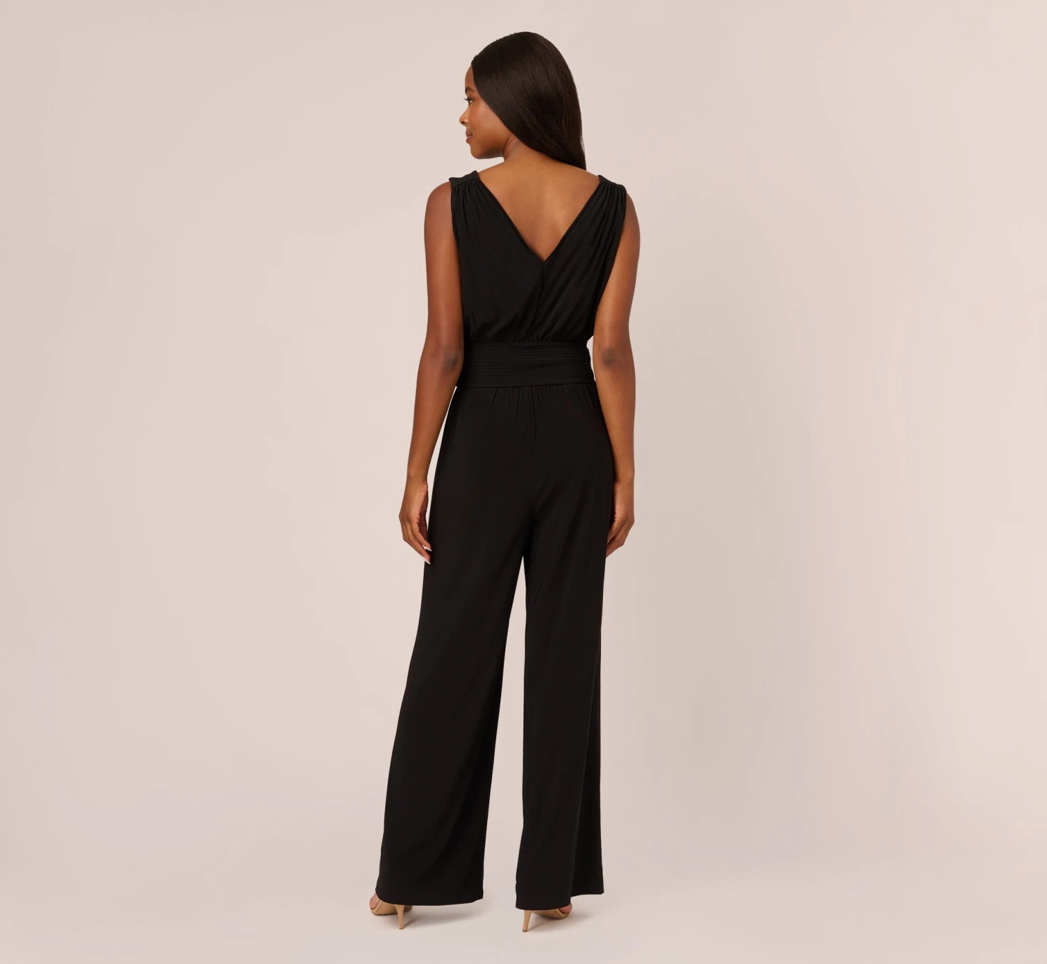 Day or night, this jumpsuit is a look that you’ll love finding new ways to wear. This sleeveless jumpsuit features a pleated bodice with v-neckline and back, a smocked waist, and wide leg pants. Crafted from mixed fabrications for a contrasting look, this pull-on jumpsuit will be themost comfortable style in your closet. Styled with metallic accessories, this jumpsuit is perfect for a wedding, or top it with a blazer to shine during a day at work.