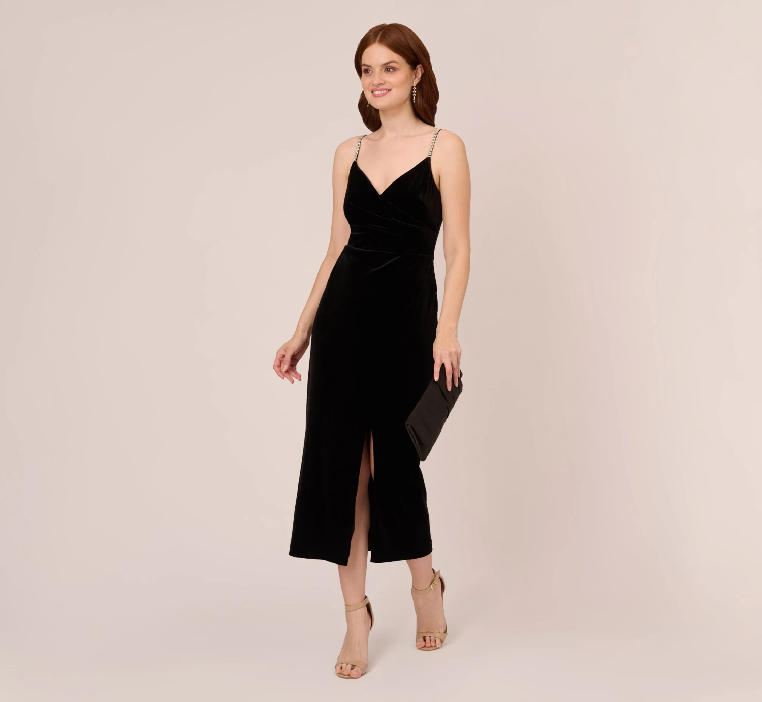 Make every room shine a little brighter when you slip into this velvet dress. This formal dress features a faux wrap bodice with large pleated details, rhinestone-clad tank straps, and an ankle-length skirt. Crafted from a delightfully soft velvet, this ankle-length dress has subtle stretch. A zipper closure at the center back of this sleeveless gown. Matching stone accessories will add further glamor to this velvet gown for formal and black-tie events.