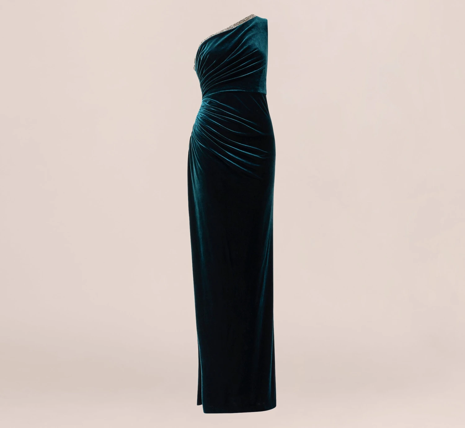 Adrianna Papell Velvet One Shoulder Gown With Beaded Neckline In Hunter