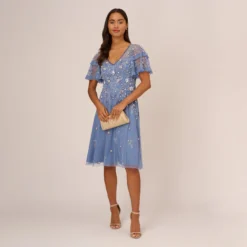 Adrianna Papell Embroidered Sleeveless Midi Cocktail Dress In Skyway