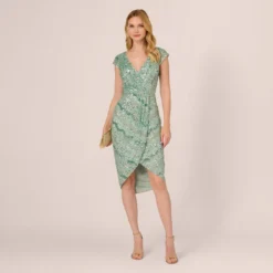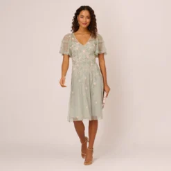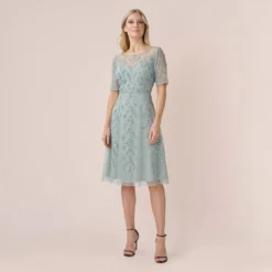 Adrianna Papell Hand-Beaded Illusion Midi-Length Fit-And-Flare Cocktail Dress In Frosted Sage