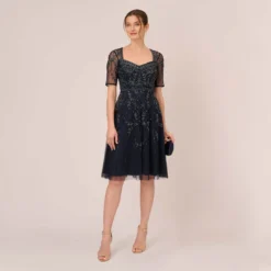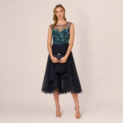 Adrianna Papell Beaded Midi Dress With Tulle Skirt In Midnight Multi