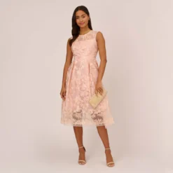 Adrianna Papell Embroidered Fit And Flare Midi Dress With Sheer Neckline In Apricot Ice