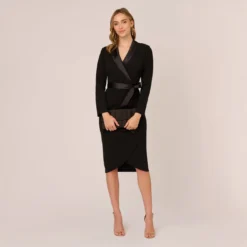 Adrianna Papell Long Sleeve Crepe Dress With Tuxedo Collar In Black