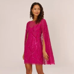 Adrianna Papell Plus Size Sequin Beaded Cape Dress With Illusion Neckline In Hot Orchid