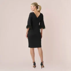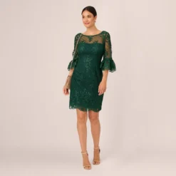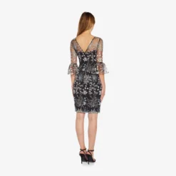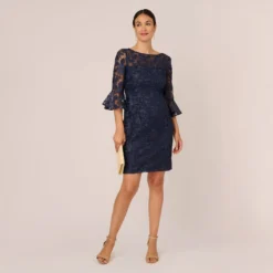 Adrianna Papell Embroidered Three Quarter Sleeve Short Sheath Dress With Bell Sleeves In Blue Multi