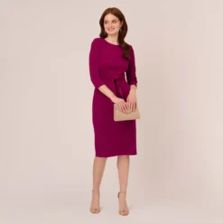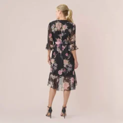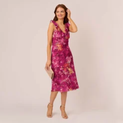 Adrianna Papell Metallic Floral Chiffon Midi Dress With Ruffled Neckline In Raspberry Multi