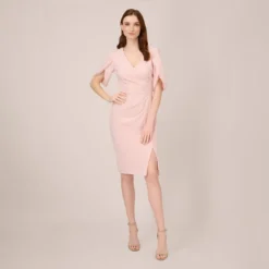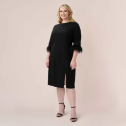 Adrianna Papell Plus Size Crepe Sheath Dress With V-Back And Feather-Trim Sleeves In Black