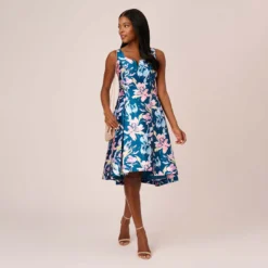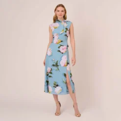 Adrianna Papell Floral Print Faux Wrap Halter Dress With Ruffle Details In Peri Multi