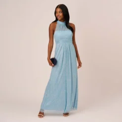 Adrianna Papell Floral Metallic Stencil Midi-Length Mermaid Dress With Capelet In Light Blue