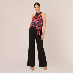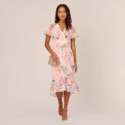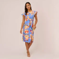 Adrianna Papell Floral-Print Stretch Twill And Chiffon Short Dress With Flounce Hem In Navy Multi