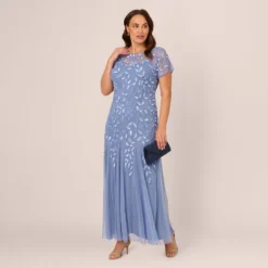 Adrianna Papell Plus Size Floral Beaded Dress With Sheer Flutter Sleeves In Navy Blush
