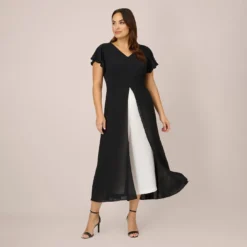Adrianna Papell Plus Size Colorblock Matte Crepe Cropped Jumpsuit With Skirt Overlay In Black Ivory